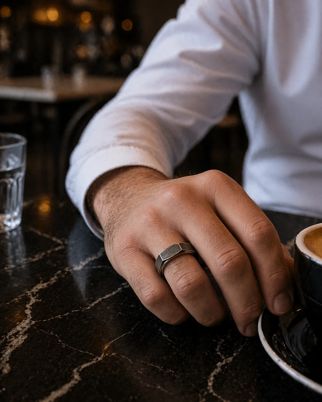 Minimalizm, który przyciąga uwagę. Ten sygnet to połączenie nowoczesnej formy z ponadczasową elegancją — idealny zarówno na co dzień, jak i na wyjątkowe okazje.